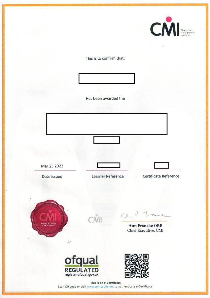 To verify your e-certificate please scan the QR code at the bottom of the document you wish to verify. You can use your smart phone camera to scan. e-Certificates are fully secure and can also be verified by visiting CMI’s e-Certificate verification portal and manually entering the learner’s Certificate Reference Number and Learner reference.